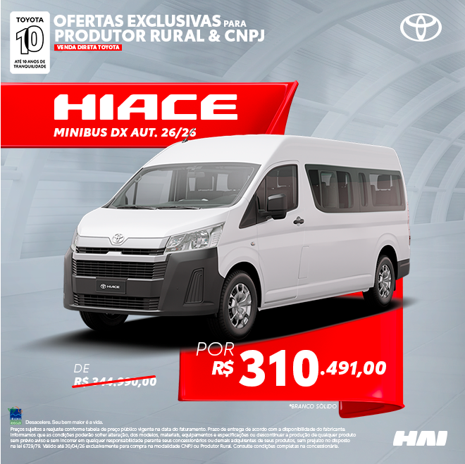 A Hiace é a escolha perfeita para quem busca eficiência e agilidade no dia a dia. Com seu raio de giro compacto de 6,9 metros, ela transforma manobras em espaços apertados em uma tarefa simples e rápida, seja nas ruas movimentadas da cidade, garagens ou em estacionamentos desafiadores. Experimente a liberdade de dirigir um veículo que combina praticidade e conforto!